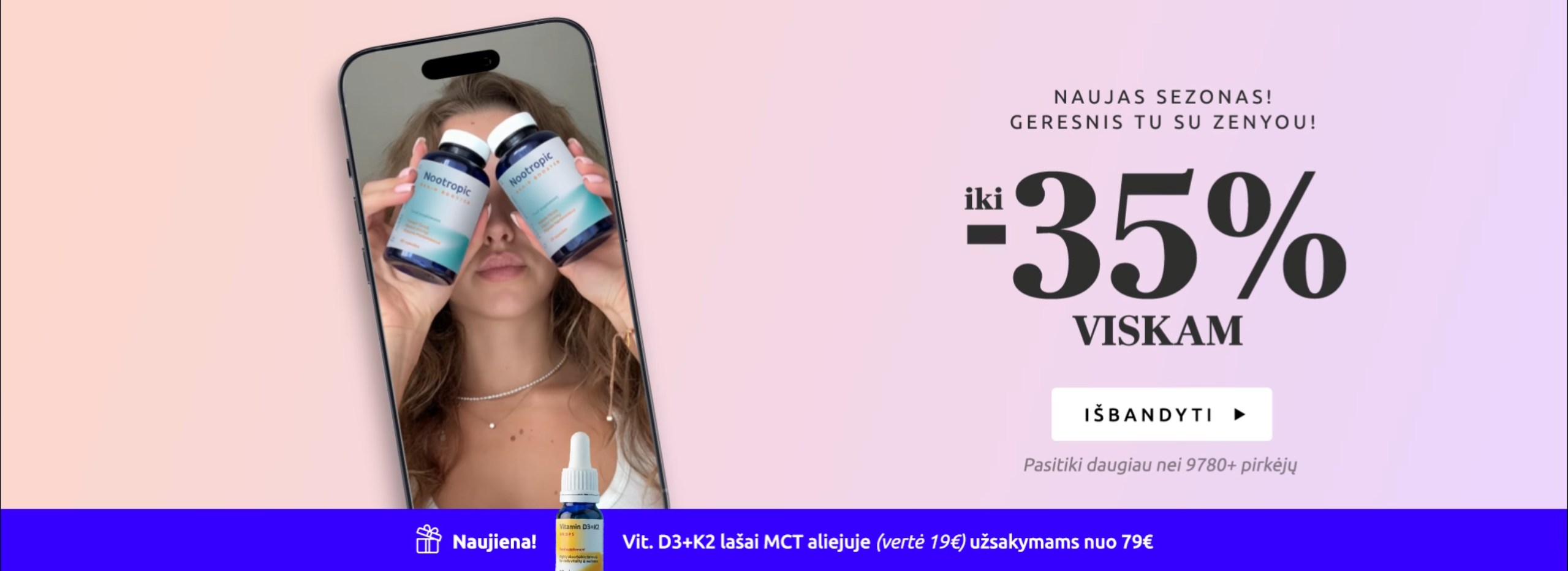 „Labai džiaugiuosi atradusi Rūtos patarimus jos kuriamą produkciją. Jau kurį laiką vartoju NMN ir kolageną – tiek energijos seniai neturėjau! Vėl puikiai miegu, turiu jėgų dirbti ir žaisti su vaikais, dingo lėtinis nuovargis, o nuo kolageno oda pasidarė stangresnė, sumažėjo smulkių raukšlių ir net apmažėjo pigmentacija! Parekomendavau ir sesei, tai dabar visa šeima perka ir džiaugiasi atjaunėjimu 😊 ”