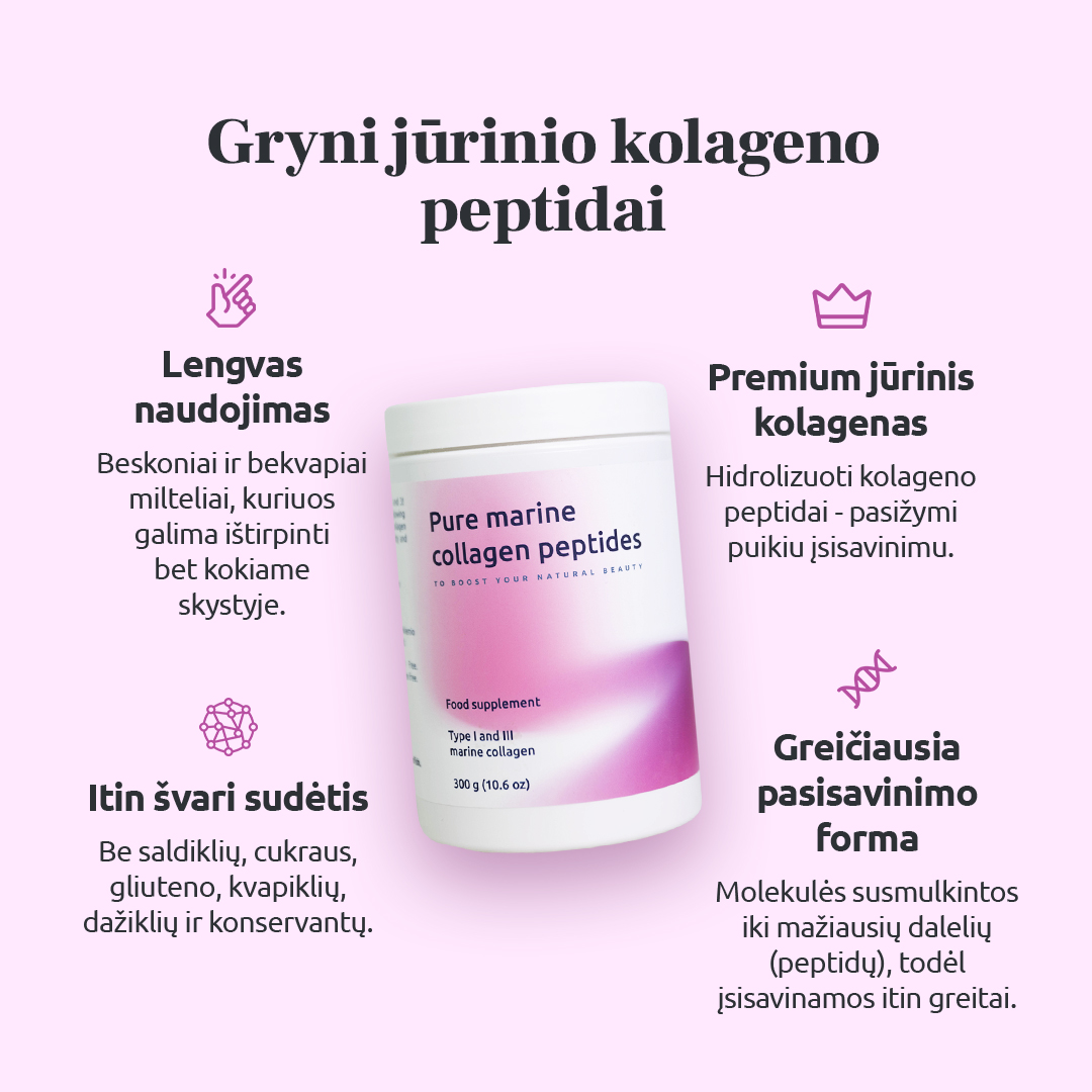 - Mūsų kolagenas ypatingas tuo, kad šiame produkte kolageno molekulės yra susmulkintos iki mažiausių ir greičiausiai pasisavinančių dalių – peptidų;