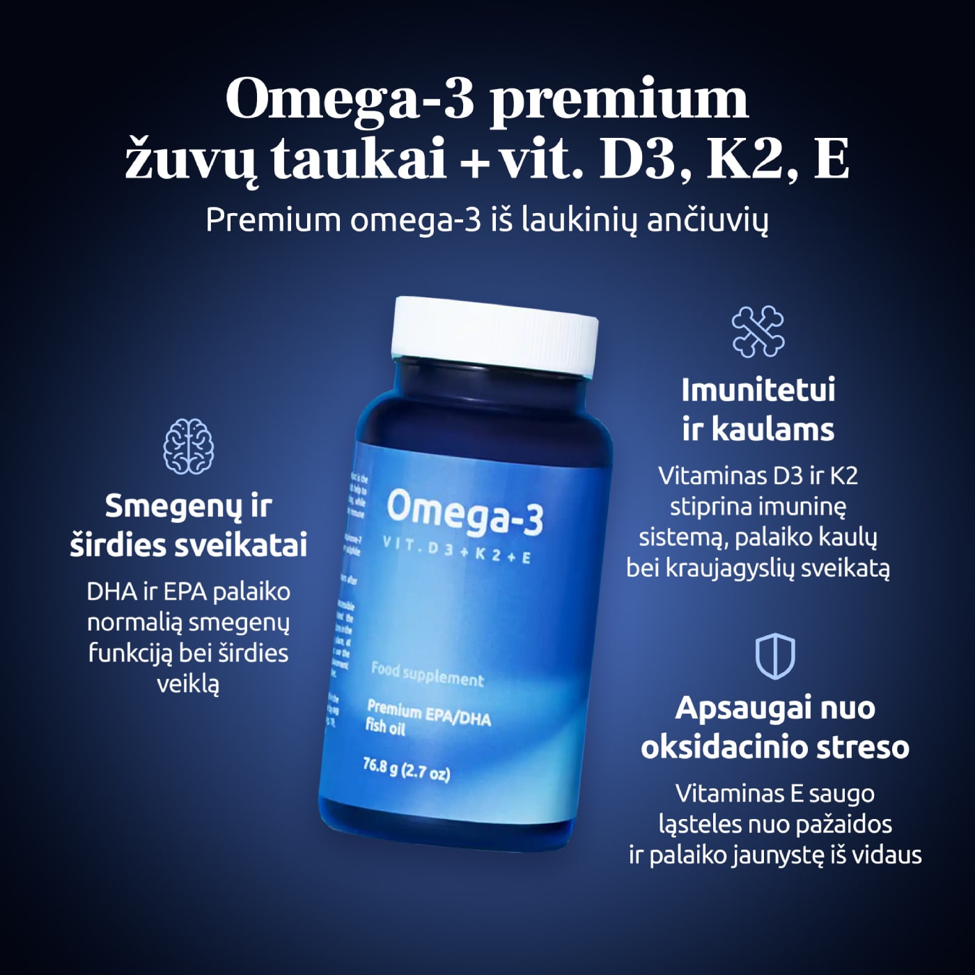 - Omega-3 riebalų rūgštys gali padėti palaikyti sveiką imuninę sistemą, optimalią smegenų ir pažinimo funkcijas; Sudėtyje esanti dokozaheksaeninė rūgštis (DHR) padeda palaikyti normalią smegenų funkciją, o sudėtyje esanti dokozaheksaeninė rūgštis kartu su eikozapentaenine rūgštimi (EPR) padeda palaikyti normalią širdies veiklą.