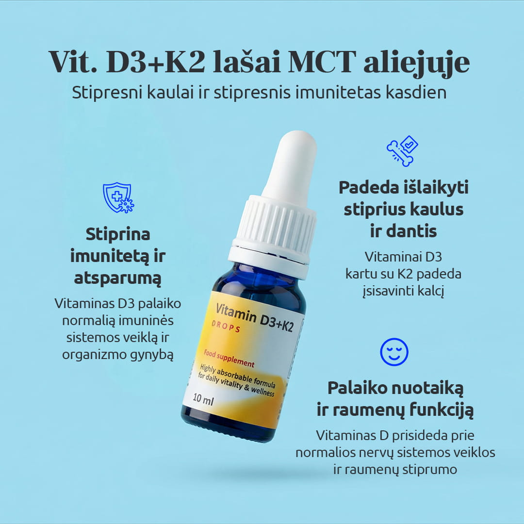 Vitaminas D3 (cholekalciferolis) yra daugiau nei paprastas vitaminas – jis veikia kaip “hormonas”, dalyvaujantis kalcio ir fosforo apykaitoje, kaulų ir dantų mineralizacijoje, imuninės sistemos veikloje, nervų sistemos ir raumenų funkcijose, gali prisidėti prie nuotaikos, energijos ir net bendro hormonų balanso. Jis padeda žarnyne pasisavinti kalcį ir fosforą, palaikyti tinkamą kalcio kiekį kraujyje ir kartu su vitaminu K2 (menakvinonu) nukreipia kalcį į kaulus bei dantis, o no ne į kraujagyslių sieneles (taip jos yra apsaugomos nuo kalcifikacijos („kalkėjimo”), ko pasekoje yra sumažinama insultų ir infarktų rizika. Vitamino D receptorių yra ir smegenyse, todėl jis gali prisidėti prie nuotaikos reguliacijos, streso tolerancijos ir kognityvinių funkcijų, taip pat veikia raumenų skaidulas, gali padėti gerinti jėgą, koordinaciją ir mažinti kritimų riziką vyresniame amžiuje. Be to, vit. D3 moduliuoja imunitetą – stiprina įgimtą gynybą prieš infekcijas ir padeda slopinti lėtinį žemo laipsnio uždegimą, kuris siejamas su senėjimu, širdies ir autoimuninėmis ligomis, dalyvauja insulino sekrecijos bei jautrumo reguliacijoje ir daro įtaką metaboliniam sindromui bei kardiometabolinei rizikai.