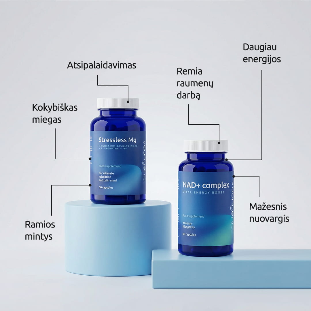 Energijos pliūpsnis – stipresnis kūnas, aiškesnis protas, geresnis miegas! NAD+ booster yra subalansuota švari, Lietuvos mokslininkų sukurta kombinacija, padedanti palaikyti normalią energijos apykaitą, nervų sistemos veiklą ir psichologinę pusiausvyrą, kai tau to labiausiai reikia.