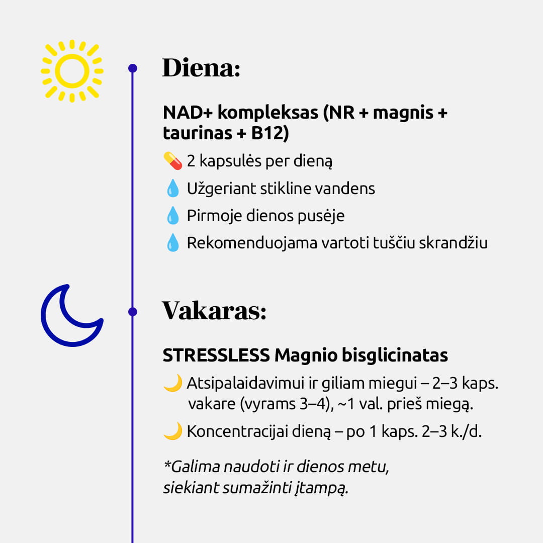 NAD+ kompleksas energijai (NR, magnis, taurinas, B12)